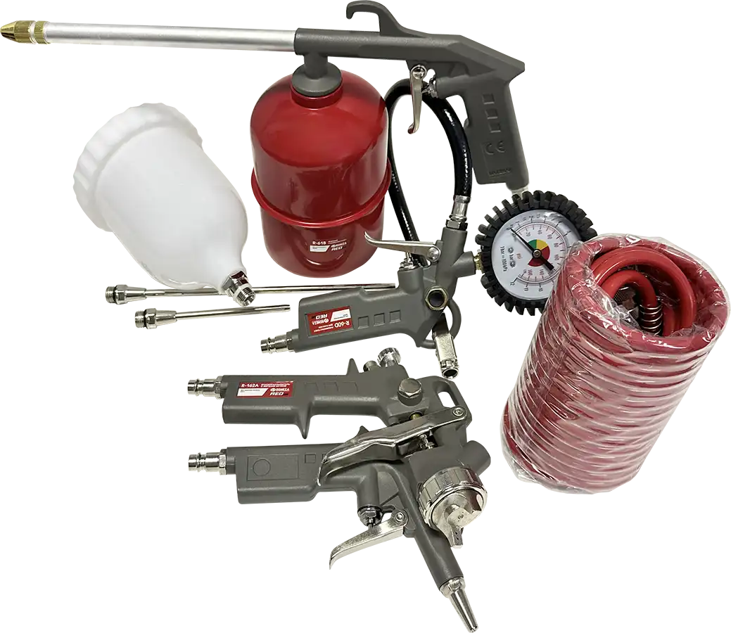 Все инструменты в наборах имеют быстросъёмное подключение, благодаря чему к спиральному шлангу можно быстро подключить любой инструмент и приступить к выполнению рабочей операции.